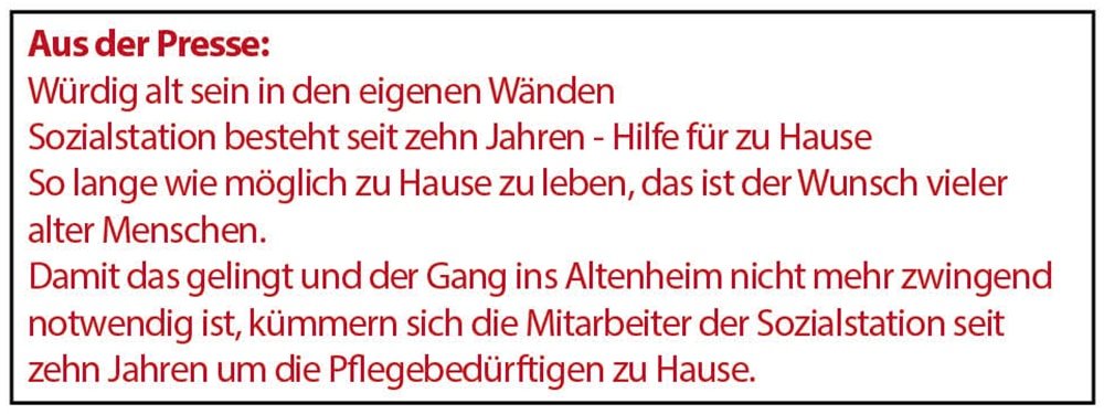 Aus der Presse 2011 Veröffentlicht 6. März 2016 at 1000 × 375 in Sozialstation Süd Häusliche Kranken- und Altenpflege GmbH: im März 2016 ← Vorheriger Nächste →
